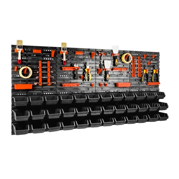 A new type of tool board, improved fittings and new tool hangers. Very easy installation on the wall using plugs or screws. Signs can be customized and adapted to your needs. The shelves can use different sizes of storage bins and different types of holders available in our store. Thanks to the tray in the garage or workshop, you can organize tools, screws, washers, etc.